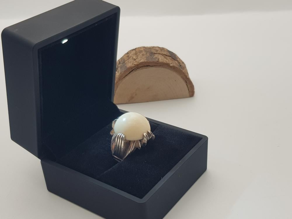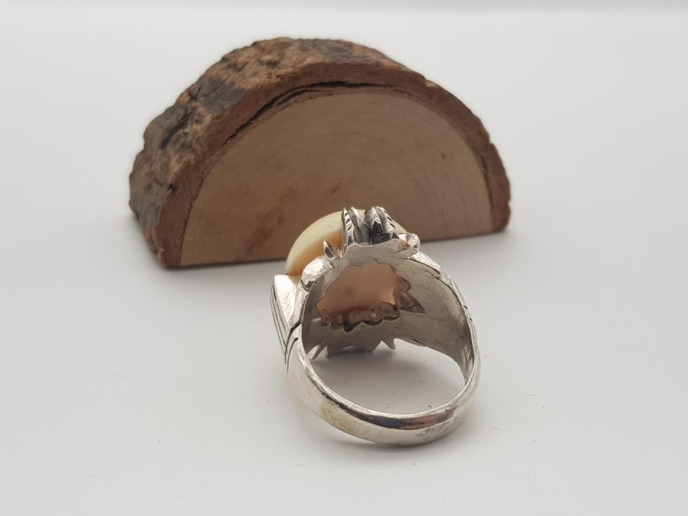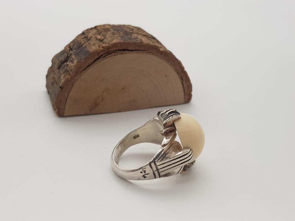 تم صناعة الخاتم يدويًا من الفضة النقية الخالص عيار 925 ومطعمة بالعاج الطبيعي .