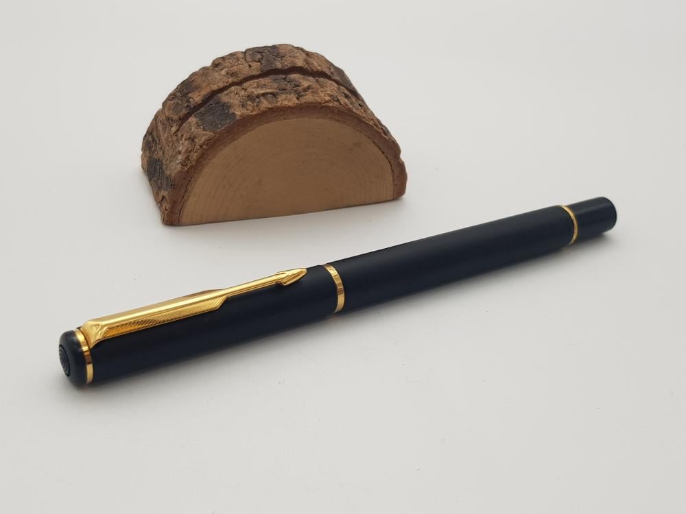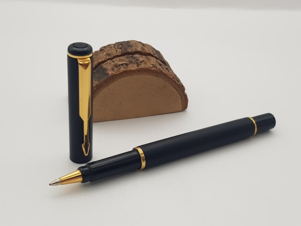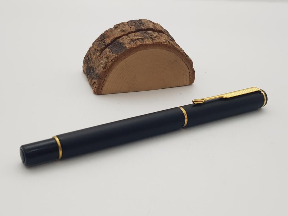هيكل القلم :صنع هيكل القلم من المعدن بالكامل ومطلي باللون الأسود المطفي مع مشبك وتفاصيل مطلية بالذهب الخالص.